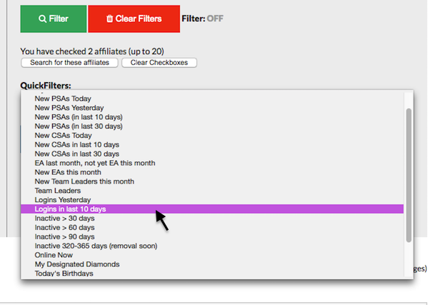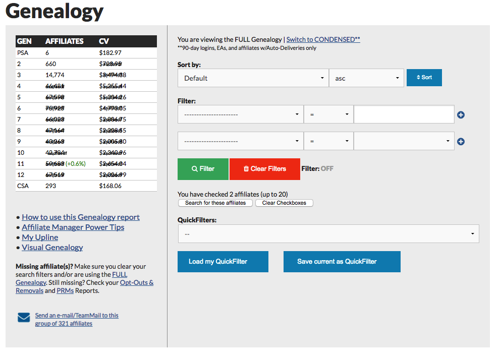 Additionally, your Genealogy already has several QuickFilters available for you to use. These QuickFilters represent the most popular searches many Affiliates find themselves using regularly. Use them whenever you want fast access to information about your Affiliates, and identify those who may need assistance, encouragement, recognition, etc. For example, you may want to select the New Team Leaders this month QuickFilter to provide encouragement and rewards to up-and-comers in your organization. Or, you may want to reach out to those in your organization in danger of being removed from the SFI program due to inactivity; simply choose the Inactive 320-365 Days (Removal soon)QuickFilter to easily identify these Affiliates.