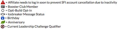 You may also notice various icons directly before an Affiliate's name on your Genealogy report. These icons indicate various data for a given affiliate, as indicated below: