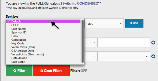 Sorts allow for easy viewing and management of your Genealogy records. The group of available sorts (as illustrated below) vary depending on the tab you've selected (i.e., Basic, Sales, Gift, etc.) and the columns of data that appear within each tab (i.e., SFI ID, Key Code, Date Joined, etc.). Just select the sort you want from the dropdown menu, choose ascending (ASC) or descending (DSC) order, and click the Sort button to view your data for a given column in the order you want. NOTE: to view the kind of data displayed in a column, just hover your mouse over the column's linked title.