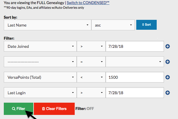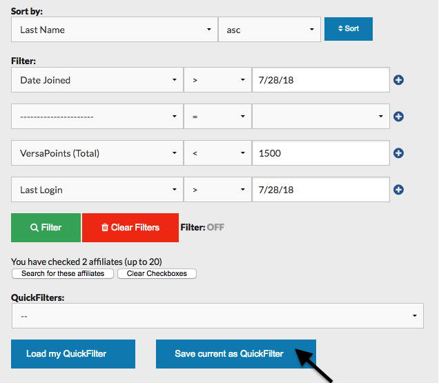 Click the plus sign to the right of that filter to duplicate the filter list. Then, on the duplicated filter, select VersaPoints (Total), the "<" (the less than sign) and 1500 to limit the results further to affiliates with less than 1500 VP.