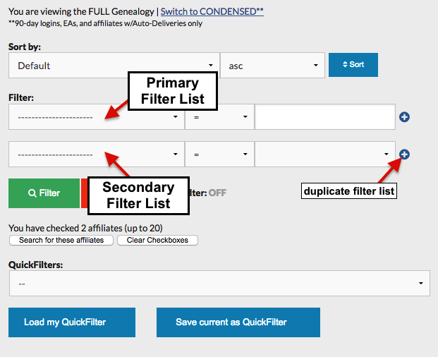 The right half of this box contains the sort and filter fields you can use to drill down in your organization to produce lists of affiliates who meet a variety of chosen criteria. We'll also discuss these search fields in detail a little later in this article.